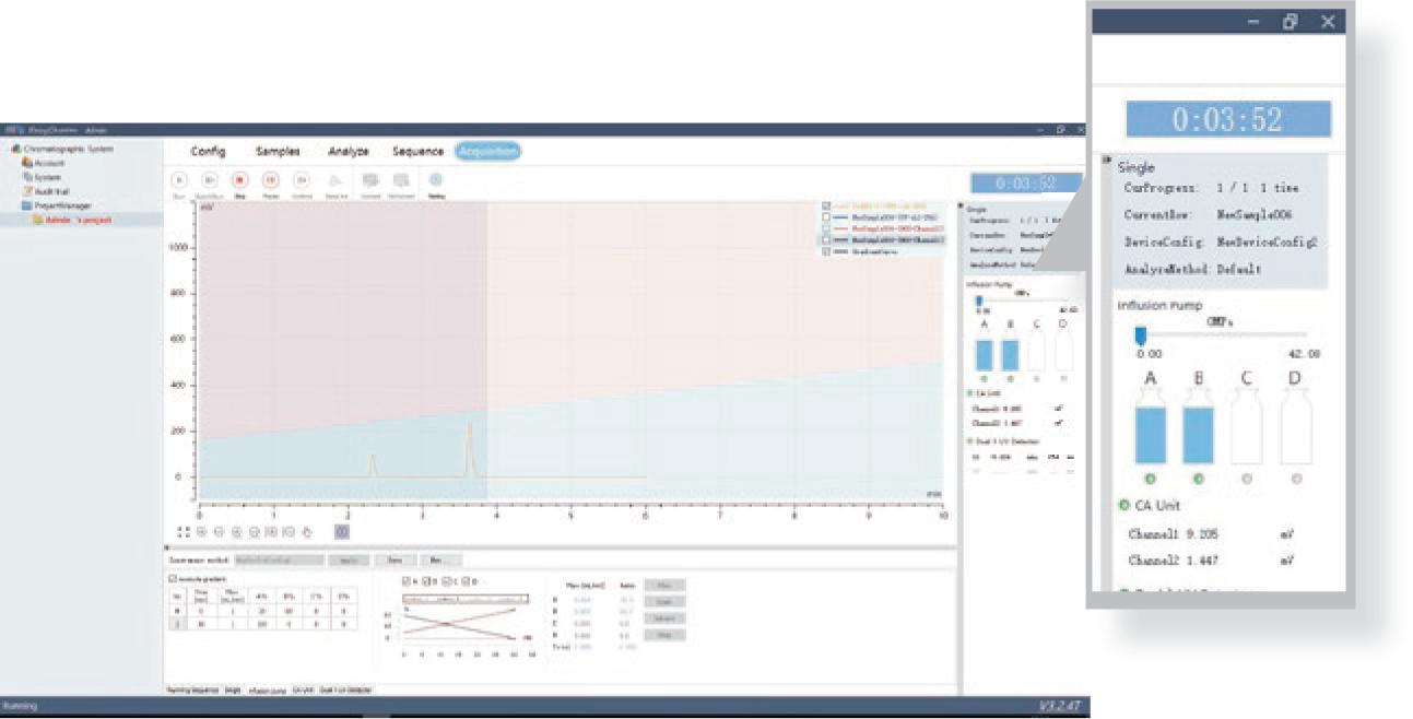 HP-3000色譜工作站是專門為制備、純化的客戶而開發(fā)的,很好的將儀器控制和譜圖處理進(jìn)行了融合,整體界面簡潔清楚,一目了然。針對(duì)制備色譜的要求,去除了部分繁瑣的譜圖處理功能使之更適合與制備。