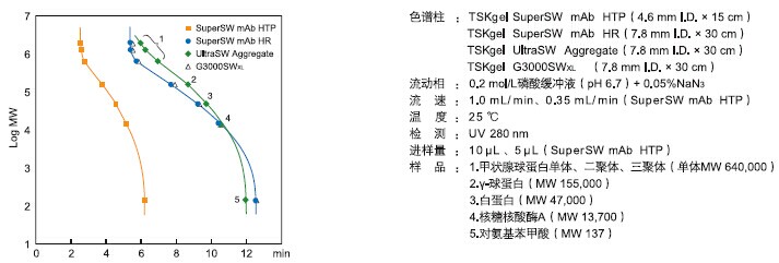 1. TSKgel SuperSW柱有內(nèi)徑為4μm的顆粒,能實現(xiàn)最高分辨率。窄至4.6mm內(nèi)徑的柱能在一定量的樣品質量范圍內(nèi)提高高靈敏度。