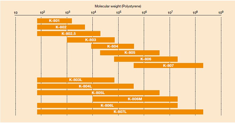 GPC K-804是標準的油溶性SEC色譜柱,適用于從低分子量到高分子量的寬范圍的樣品。流動相是氯仿。