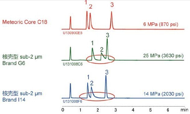 Meteoric Core C18與常規使用的全多孔型C18相比,在相同條件下可使分析時間縮短至2/3。因其具有卓越的分離能力,即使將流速提高1倍,仍可維持高效的理論塔板數狀態并使分析時間縮短至1/3,而此時色譜柱背壓不足5000psi,與普通Sub-2um色譜柱相比,色譜柱背壓更低的Meteoric Core C18為HPLC和UHPLC的使用分析中提供了高性能高生產性的新選擇。