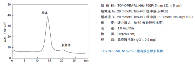 ????陰離子交換填料在抗體的純化工藝中一般通過流穿模式來去除樣品中的宿主細(xì)胞蛋白、核酸、內(nèi)毒素、多聚體等雜質(zhì)。? TOYOPEARL GigaCap Q-650M、TOYOPEARL Q-600C AR、TOYOPEARL NH2 -750F 等,均是高載量型的優(yōu)異層析填料。