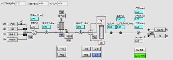 層析系統(tǒng)軟件符合新版GMP規(guī)范,采用圖形化界面、全自動操作,簡明扼要,任何操作及狀態(tài)均可實(shí)時(shí)顯示在主界面狀態(tài)欄中,自動化程度高。結(jié)合了大量的容錯(cuò)性設(shè)計(jì),貼合生產(chǎn)實(shí)際,降低了對研發(fā)人員的技能要求。