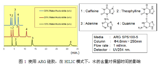在HILIC模式下,通常使用乙腈/水做流動相。極性大的洗脫劑使得樣品在ARG硅膠上保留變差,所以增加水的含量,洗脫時間變短。因此,ARG硅膠的分離模式和反相是不同的;在反相條件下,增加水的含量,保留時間是增加的。
