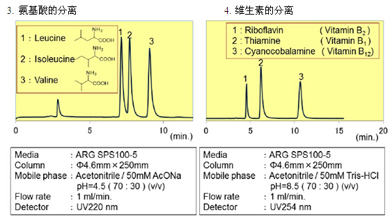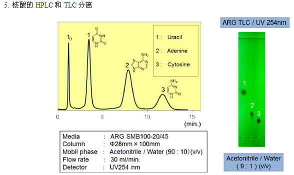 親水化合物一般是用反相模式來進行分離,例如使用C18填料。但是,仍然有很多親水的化合物不能用普通的反相模式來分離。近些年來,HILIC模式的填料應運而生,特別適合分離親水性化合物(極性大的化合物)。富士硅化學有限公司開發(fā)了HILIC模式的“ARG硅膠”。ARG硅膠可用于分離氨基酸、多肽、維生素和核酸。不同粒徑的ARG硅膠可分別應用于分析以及大規(guī)模的分離純化。