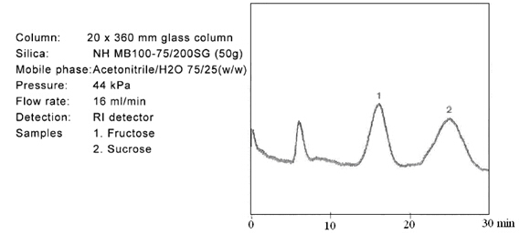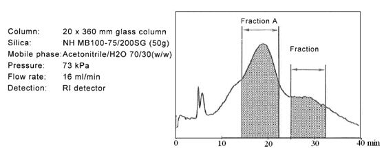 ? ? ? 糖類物質的分析和制備,在液相色譜領域占有重要的地位。迄今為止,大多數的分離介質僅僅局限在分析級別。但是富士硅膠研發出用于制備色譜的新的氨基硅膠。當使用高水相為流動相時,一般的氨基填料會暴露出很多問題。氨基硅膠的pH值很高,一般pH為9.0,在這樣高的pH條件下,目標化合物一般都會變性,并且會毀壞硅膠基質的表面。考慮到這些問題,富士公司研發出新的氨基硅膠填料,稱之為NH SG硅膠。NH SG硅膠可以最小化甚至是避免上述問題,并且對糖類化合物進行更好的分離。