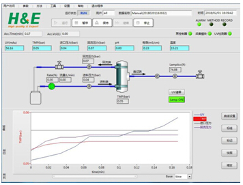 2)可設(shè)置進料壓力、TMP及透過端UV報警值,超出范圍即停泵,防止目標物損失,保證工藝可控性。