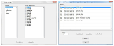 系統(tǒng)采用五級用戶管理權(quán)限,可對用戶權(quán)限進行自定義分配,并可在運行中更換用戶(便于交接班)。完善的審計追蹤及電子簽名功能,符合cGMP法規(guī)要求。