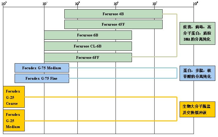 瓊脂糖凝膠過濾介質有4%和6%瓊脂糖兩種類型,稱為Focurose 4B 和Focurose 6B。在瓊脂糖凝膠的基礎上低強度交聯得到交聯瓊脂糖凝膠(CL),稱為Focurose CL-4B和Focurose CL-6B,交聯瓊脂糖凝膠有更好的物理及化學穩定性。在瓊脂糖凝膠的基礎上高強度交聯得到高流速瓊脂糖凝膠(FF),稱為Focurose 4FF和Focurose 6FF。FF系列瓊脂糖凝膠有良好的物理及化學穩定性,可進行濕熱滅菌,可耐受蛋白生產中的各種工作條件。